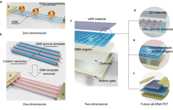 ▲DNA纳米结构与多维异质材料协同构筑的纳米电子器件示意图
