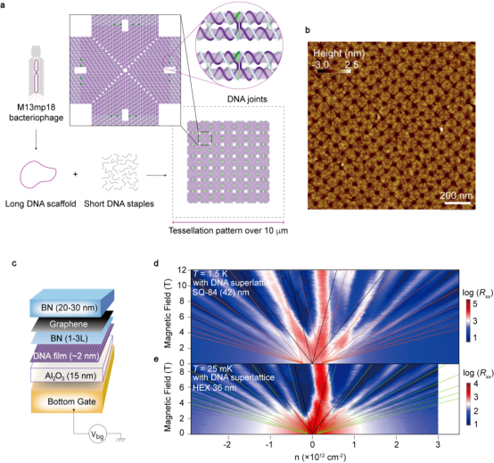 据悉,研究团队通过优化DNA折纸结构的设计参数,成功构建了尺寸达到10微米级别的高质量DNA折纸二维晶格。研究人员通过干法转移技术,将硬物质石墨烯、六方氮化硼与软物质DNA折纸二维晶格相结合,制备出具有二维软硬物质界面的微纳器件。在研究中,团队通过输运表征在具有二维软硬物质界面的微纳器件中观察到了DNA折纸二维晶格对石墨烯电子态的调控作用。研究人员发现,这一作用具体表现为DNA折纸二维晶格的周期由于能带折叠产生的态密度极小值,在磁场下衍生出除石墨烯本身的朗道扇形图之外次级朗道扇形。