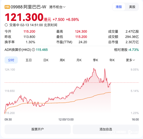 受该消息影响,阿里股价飙升。截至发稿,阿里巴巴港股已涨超6%,报121.3港元,总市值2.3万亿。年初至今,阿里巴巴港股涨幅近50%。