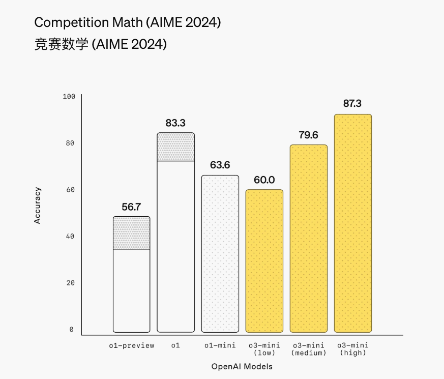 在周五的新闻稿中,OpenAI披露,在2024年美国数学邀请赛(AIME 2024)的测试中,低推理努力的o3-mini准确率(60%)与o1-mini差不多,但速率更快;而在中等努力下,o3-mini准确率能够提升到79.6%,与o1模型相当。在最高努力水平时,o3-mini的准确率则能进一步提升至87.3%。