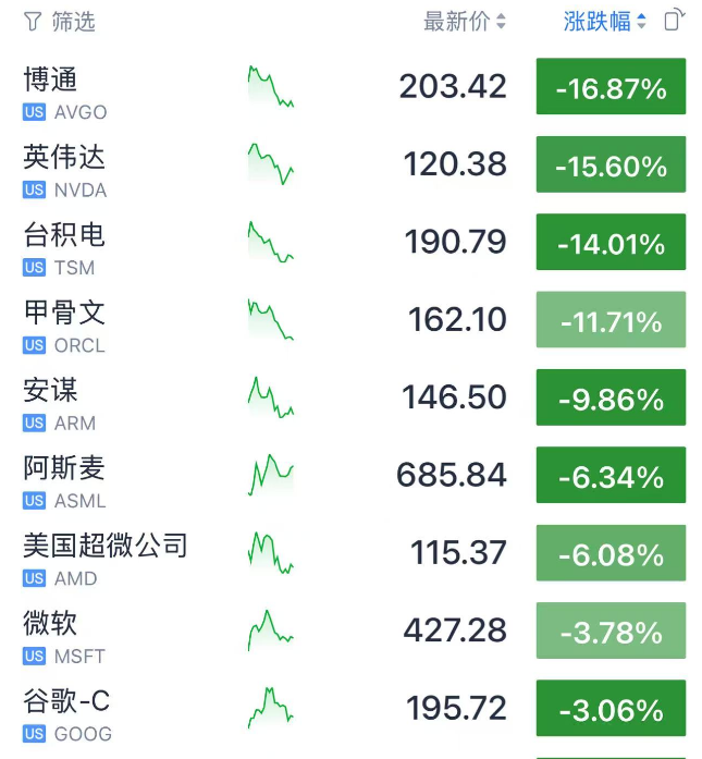 全球科技股纷纷下跌,英伟达暴跌15%!纳斯达克指数暴跌超3%,该指数以科技股为主。除英伟达外,其他芯片股也在暴跌,博通公司暴跌近17%,台积电暴跌14%,阿斯麦暴跌超6%。