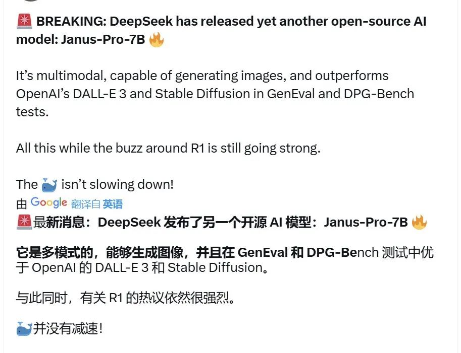 北京时间1月28日凌晨,就在美国科技股暴跌之际,人工智能社区Hugging Face显示,DeepSeek发布了开源多模态人工智能模型Janus-Pro。其中Janus-Pro-7B在GenEval和DPG-Bench基准测试中击败了OpenAI的DALL-E 3和Stable Diffusion。