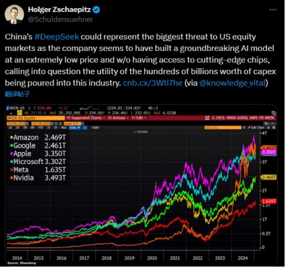 著名财经记者Holger Zschaepitz 1月25日表示,DeepSeek以极低的价格建立了一个突破性的AI模型,而且没有使用尖端芯片,这让人们质疑该行业数千亿美元资本支出的效用。