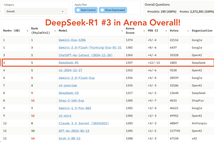 1月24日,DeepSeek-R1在聊天机器人竞技场综合榜单上排名第三,与顶尖推理模型o1并列。