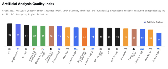 Artificial-Analysis对DeepSeek-R1的初始基准测试结果也显示,DeepSeek-R1在AI分析质量指数中取得第二高分,价格是o1的约三十分之一。