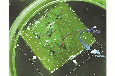此次新开发的电机尺寸非常之小,甚至比一根头发丝还要细得多。它们被嵌入到一种合成凝胶材料内部,添加“燃料”后,就会像小型汽车引擎那样运作,将燃料转换为能量,同时排出废料。这个过程中产生的能量用来旋转电机,进而扭曲凝胶中的分子链,使凝胶本身收缩并储存能量,这有点像把松紧带拧起来储存弹性势能。