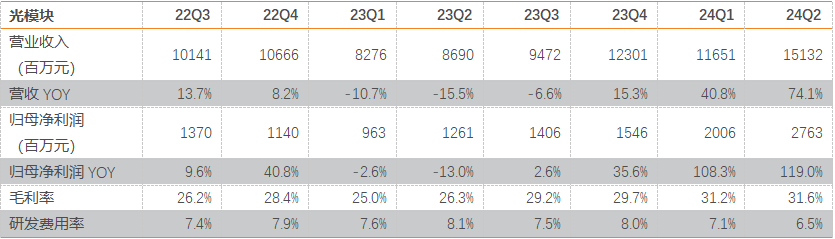 章林认为,光模块作为国内参与全球AI发展的关键环节,受益于AI技术变革。模型参数、训练数据以及算力卡规模的快速增加,推动网络集群向更大集群、更高带宽方向升级,对网络互联提出更高要求,驱动光模块速率迭代加快,提升了板块的成长性,巩固了行业竞争格局。从2023年开始,部分光模块公司业绩持续释放,在实现收入高速增长的同时,盈利能力实现不同程度的提升。