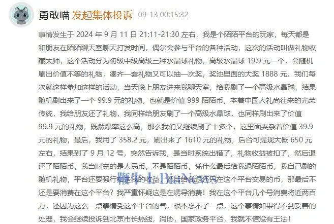 消费者认为陌陌平台系统的问题不应该由用户承担责任,并要求陌陌官方原路退回充值金额。目前,消费者不接受官方给出的解决方案,陌陌官方暂未作出回应。