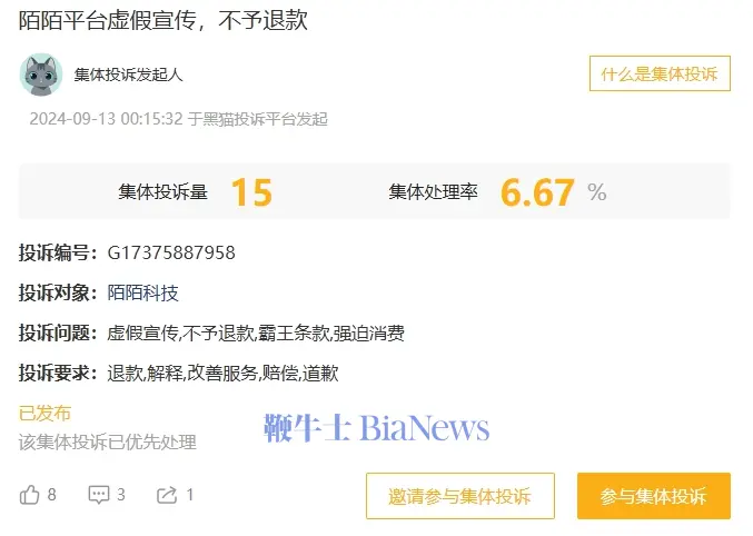 9月23日消息,有消费者近日在黑猫投诉平台上集体投诉陌陌官方存在欺骗消费者,虚假宣传,强制消费的问题。