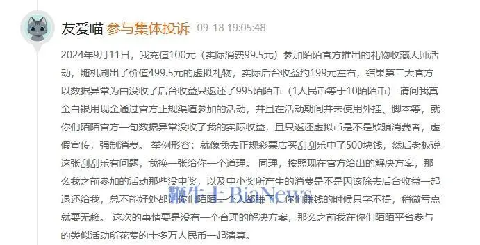 该消费者称,第二天,官方以数据异常为由没收了后台收益,只返还了995陌陌币(1人民币等于10陌陌币)。