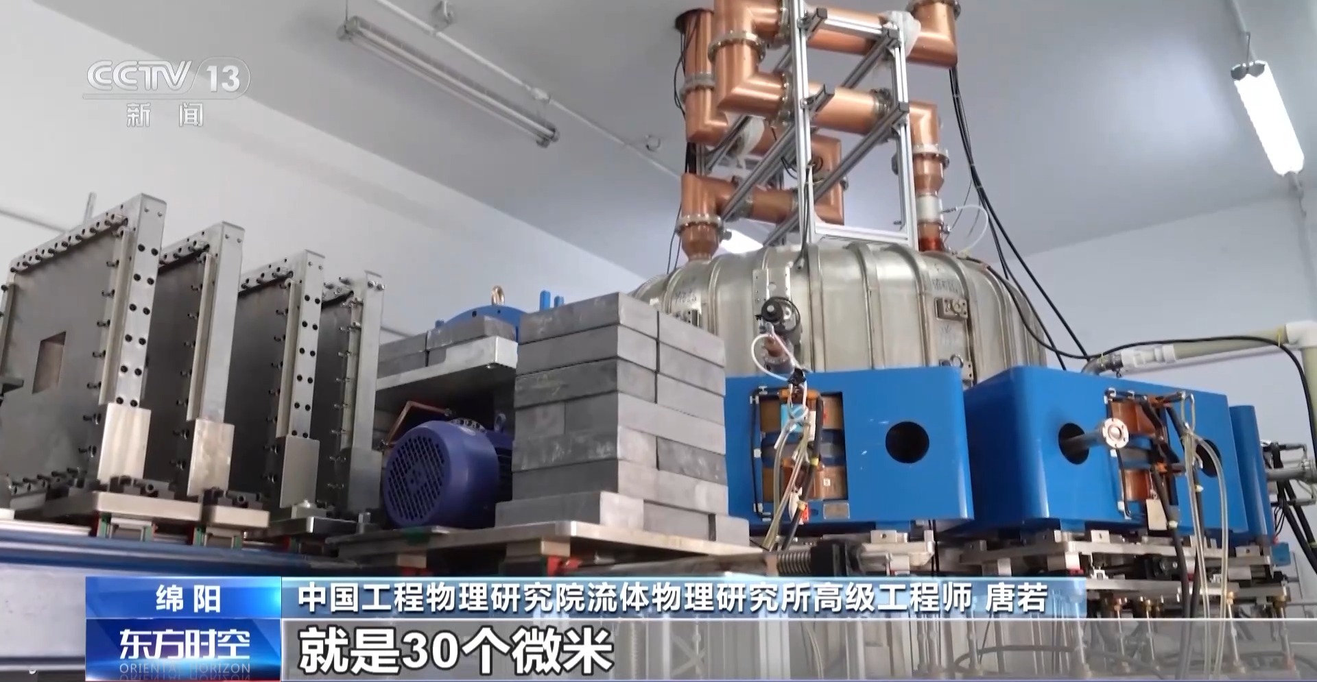中国工程物理研究院流体物理研究所高级工程师 唐若:它现在是我们高能工业CT里面世界上分辨率最高的一个装置,我们现在的整个的空间分辨率指标就做到了就是30个微米。好比在一个大铁块里面看到一根头发丝的1/3,就可以看出这样一个小的缺陷。