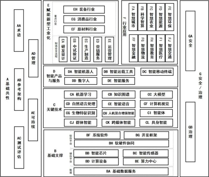 基础共性标准主要包括人工智能术语、参考架构、测试评估、管理、可持续等标准。