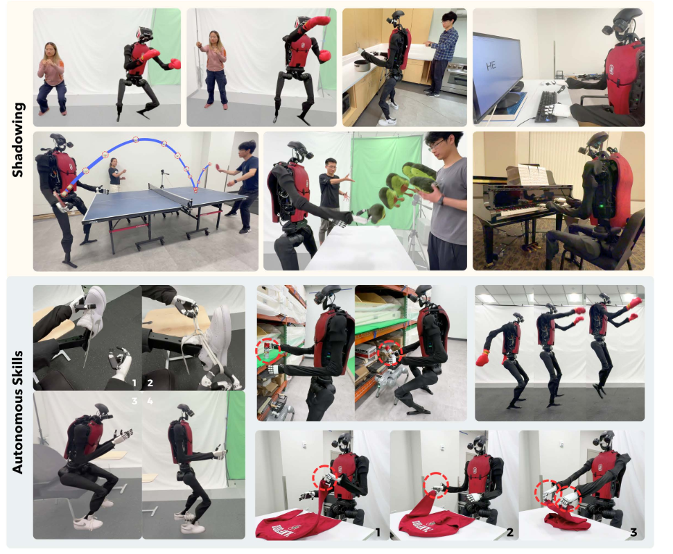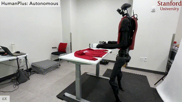 研究团队表示,HumanPlus能自主完成穿鞋站立行走、从仓库货架上拿物品、折叠运动衫、重新摆放物品、打字、打招呼等任务,成功率达60%-100%。