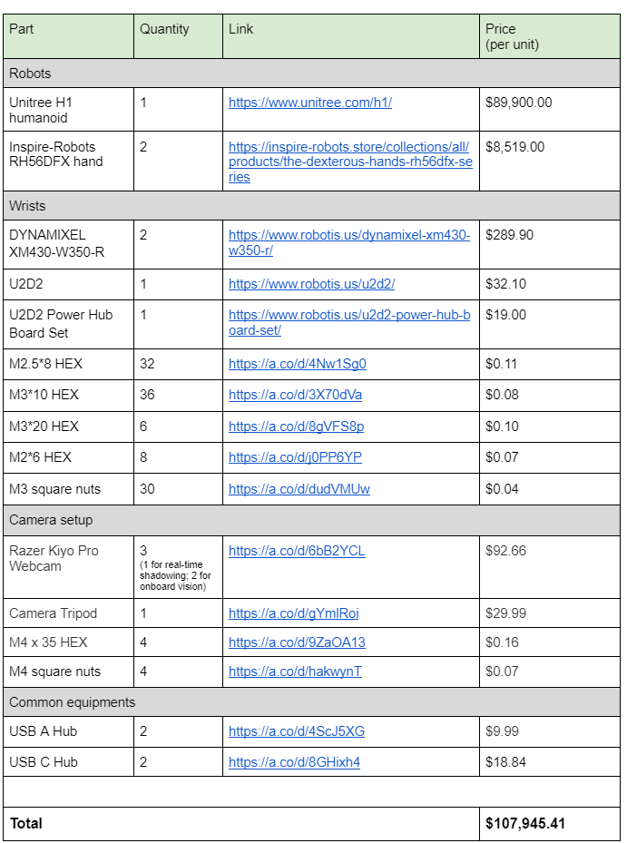 其中,主要硬件来自中国厂商,如价值8.99万美元的杭州宇树科技Unitree H1机器人平台、8519美元的北京因时机器人的手,这两者的价值合计接近10万美元,占了HumanPlus硬件成本的大头。