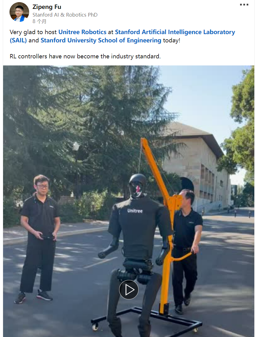 并且,根据付子鹏在社交平台的动态,他在8个月前于斯坦福大学接待了宇树科技公司,他当时上传的视频中的人形机器人疑为宇树H1。