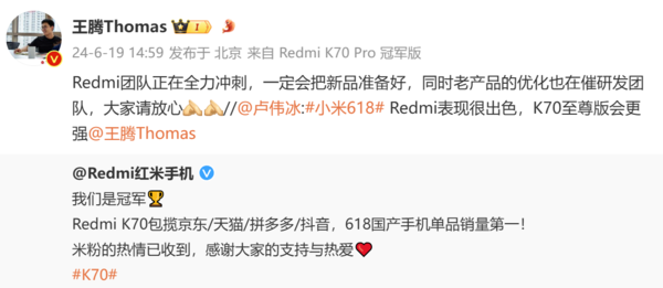 对此,Redmi品牌总经理王腾进行了回应,他在微博上表示,Redmi团队正在全力准备新产品,同时也在督促研发团队对老产品进行优化。