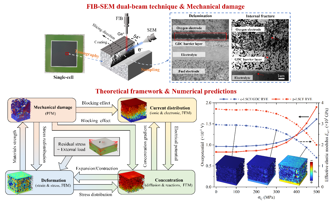 基于此,研究团队依据热力学定律,构建出力-热-电-化耦合的连续介质力学理论框架,并结合有限元方法和相场方法,定量研究出真实微观电极尺度固体氧化物电池初始性能,以揭示不同工作模式下电极内部传输、电化学反应动力学、应力和机械损伤之间复杂耦合作用。这为实现固体氧化物电池在复杂工况下的长期稳定性优化提供了科学依据,对于促进新能源技术发展具有积极意义。