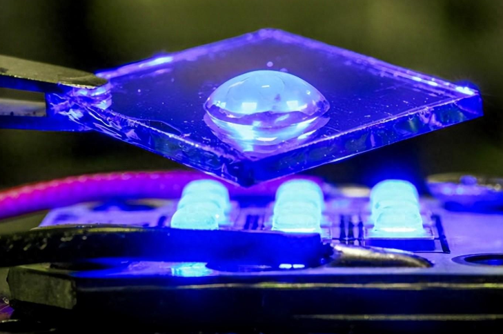 新方法是将导电塑料浸入特殊的盐溶液(一种光催化剂)中,然后用光照射它一小段时间,形成p掺杂导电塑料,其中唯一消耗的物质是空气中的氧气。图片来源:瑞典林雪平大学