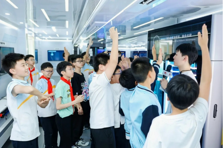 启动仪式后,华为展车迎来了首批“碳路小先锋”,在讲解员的悉心带领下,依次参观了光储、充电及数据中心三大展区,展示了华为智能光伏样板点、逆变器、“一秒一公里”华为超充等核心产品。同学们对华为数字能源展车中陈列的设备和沙盘模型充满了好奇心,探着小脑袋仔细地观察,十分积极。