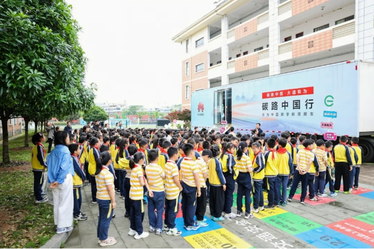 华为“碳路中国行”展车全长18米,展示面积约65平方米,在巡展车内,汇聚了华为智能光伏领域最前沿的科技成果,集中展示了清洁发电、充电网络、绿色数据中心等全场景解决方案。此次公益巡展的方式,带领同学们一起走进绿色能源大世界,用一堂课埋下一粒种。