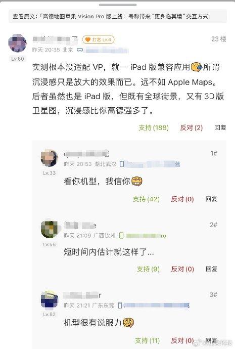 对此,有网友实测后吐槽称:“根本没适配VP,就一iPad版兼容应用所谓沉浸感只是放大的效果而已。远不如Apple Maps。”还有网友放出实测图称被欺骗。