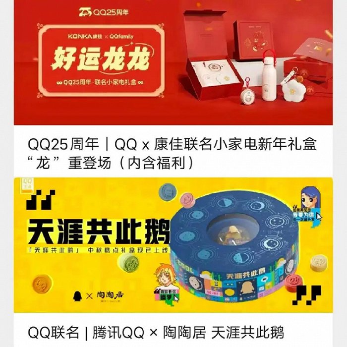 例如,腾讯QQ在从去年下半年开始,与多家企业售卖联名礼盒,像QQX陶陶居的“天涯共此鹅”糕点礼盒,在京东内上架后不久就售卖一空。今年1月,QQ还与康佳合作,推出299元的联名龙年小家电礼盒,目前仅剩40份。
