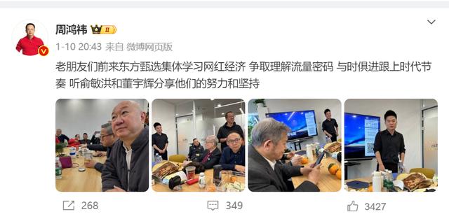 今年1月10日,周鸿祎发布微博:“老朋友们前来东方甄选集体学习网红经济,争取理解流量密码,与时俱进跟上时代节奏,听俞敏洪和董宇辉分享他们的努力和坚持。“周鸿祎在微博中还贴上了多张现场照片。
