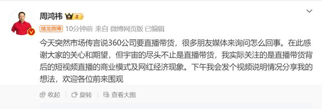 2月6日午间,针对媒体报道“周鸿祎将直播带货”一事,周鸿祎在微博发文表示,今天突然市场传言说360公司要直播带货,很多朋友媒体来询问怎么回事。