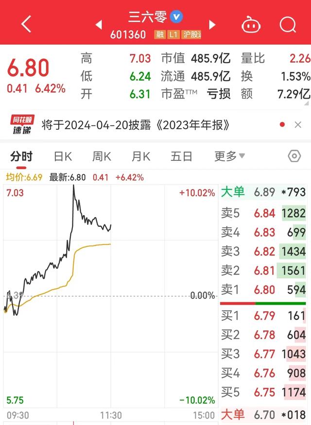 二级市场上,三六零(601360.SH)盘中拉升一度涨停,成交额超4亿元,截至2月6日午盘,三六零报6.80元/股,涨幅6.42%。