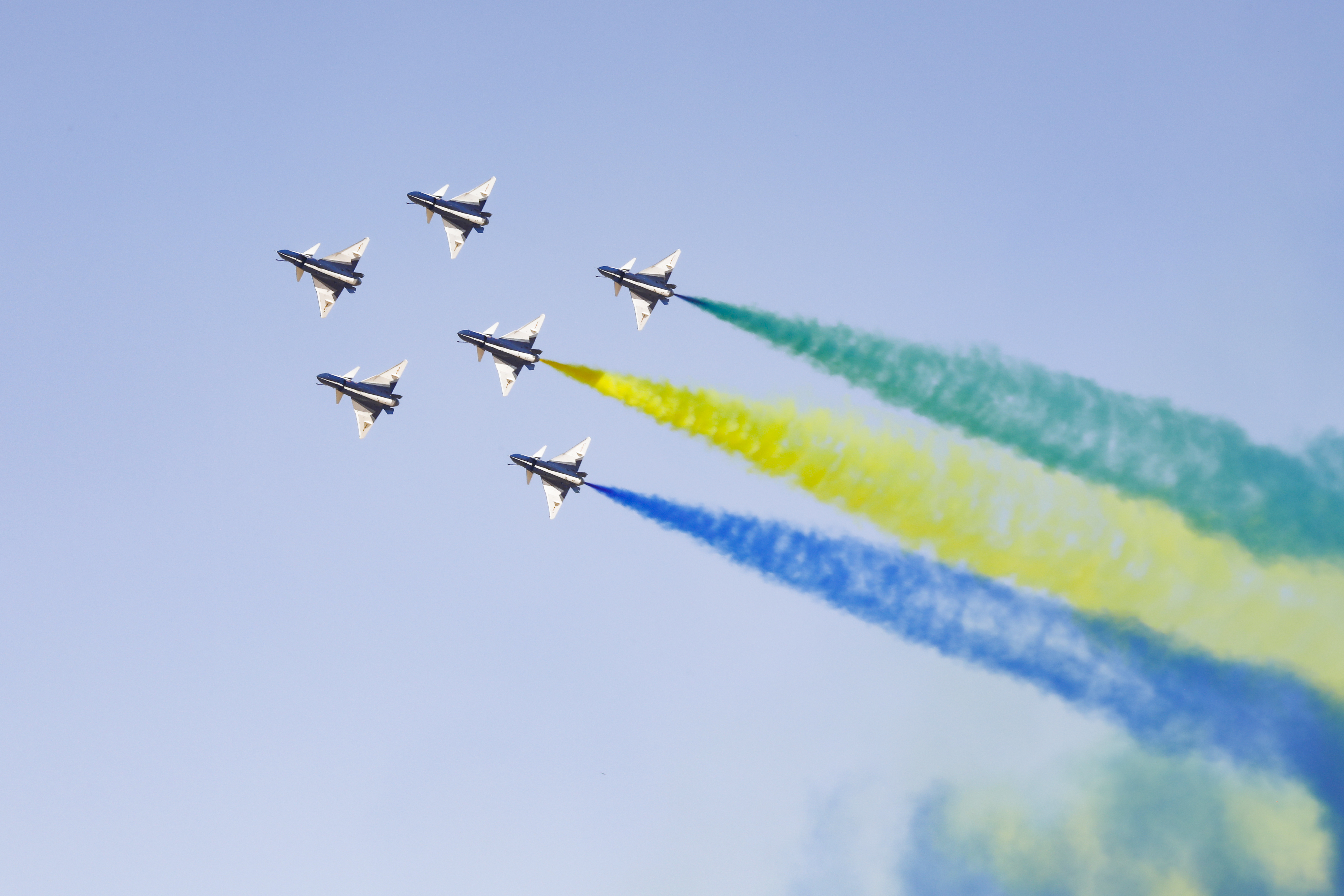 一架架表演机时而盘旋、时而俯冲,队形转换灵活自如。六机分组开花、四机垂直开花等数十个高难度动作轮番上演,动作衔接紧凑、队形整齐壮观,力量与速度的极限碰撞,技术与艺术的完美协调,展现出飞行员对飞机边界性能的超强掌控能力以及战机优异机动性能。