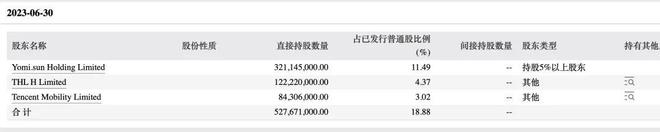 但自2020年以来,瑞银、瑞士信贷、摩根大通和贝莱德集团等主力投资机构纷纷减持这家与腾讯关系密切的电子商务服务提供商的股份。Wind数据显示,截至2023年6月,微盟集团的第一大股东为Yomi.sun Holding Limited,持股比例为11.49%,其实控人为孙涛勇、方桐舒及游凤椿一致行动人;腾讯通过其子公司THL H Limited、Tencent Mobility Limited分别持股4.37%、3.02%,共计持股7.73%,为微盟集团第二大股东。