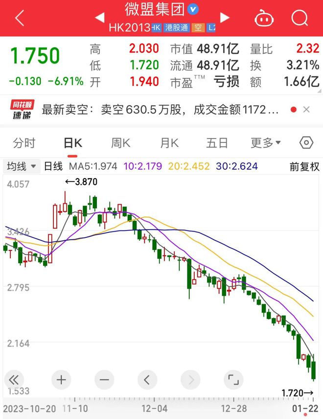 但这一业务分拆计划,却让微盟集团的股价大幅跳水。1月17日早盘,微盟集团股价大幅走低,一度跌逾15%,收盘报收1.98港元,跌11.6%。1月19日,该公司股价再度大跌,报收1.88港元,股价再次下跌6.93%。