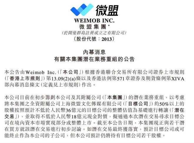 1月16日,微盟集团发布公告称,将按照上海微盟文化传媒有限公司(以下简称“微盟传媒”)整体估值不低于36亿元为基础,出售该公司50%以上的股权。最终目标是让微盟传媒在国内A股市场上市。