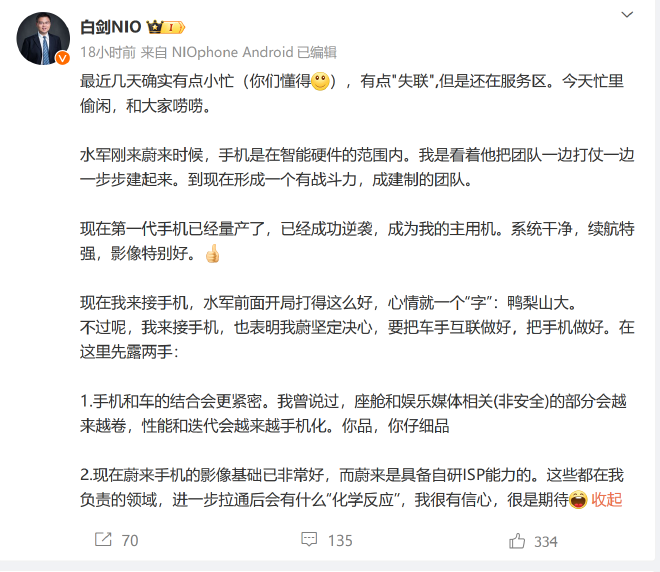 蔚来汽车副总裁副总裁白剑也在微博表示,将承接手机业务。并且也表明坚定决心要把车手互联做好,把手机做好。同时,白剑也透露,未来,手机和车的结合会更加紧密,座舱和娱乐媒体相关(非安全)部分的性能和迭代越来越手机化;并且蔚来具备自研ISP能力,可能会产生更好的化学反应。