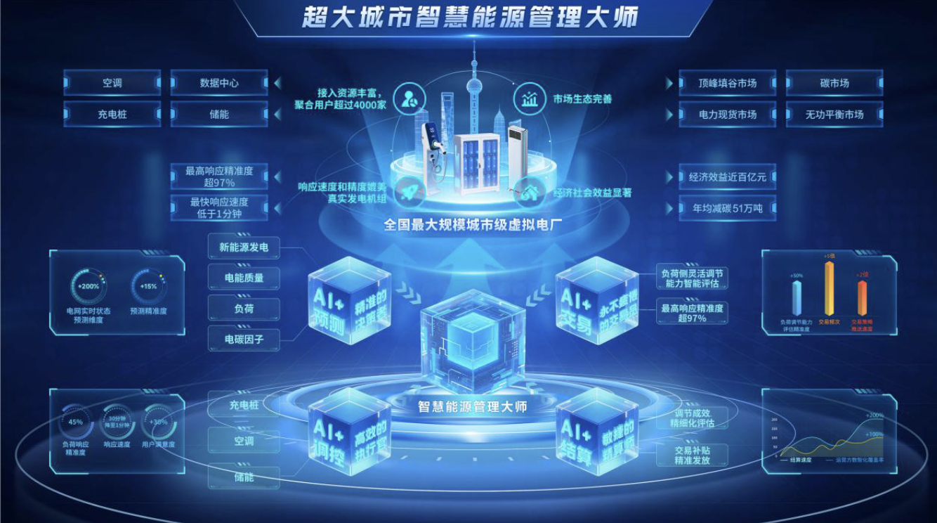 国网上海电力依托光明大模型的多模态认知与动态决策能力,构建智慧能源一站式管理“引擎”,打造“源-网-荷-储”协同互动的能源生态体系,引导虚拟电厂参与削峰填谷、调峰、调频、备用、潮流阻塞控制及故障处置等电网调控应用,实现对电网多维状态的精准预测,高频推送能源交易策略,秒级精准调节用户侧设备,成效精细化评估及补贴精准发放,为企业与政府部门、工业企业、商业机构、社会公众等用能主体提供协同化响应、多元化体验、互动化服务能力。该项目助力上海建成全国规模最大、接入资源最丰富、市场模式最多的城市级虚拟电厂,累计经济效益超80亿元,年均减碳量达51万吨。同时,国网上海电力率先实现了充换电设施与楼宇空调的秒级精准需求响应,成功实施了全国首次无功需求响应和低碳虚拟电厂的精准响应。这不仅为上海城市发展提供了安全、经济、绿色的坚实能源保障,还通过高品质电能供应,有力推动了上海人工智能产业的高质量发展。该项目成果获得与会嘉宾和社会各界的广泛好评。