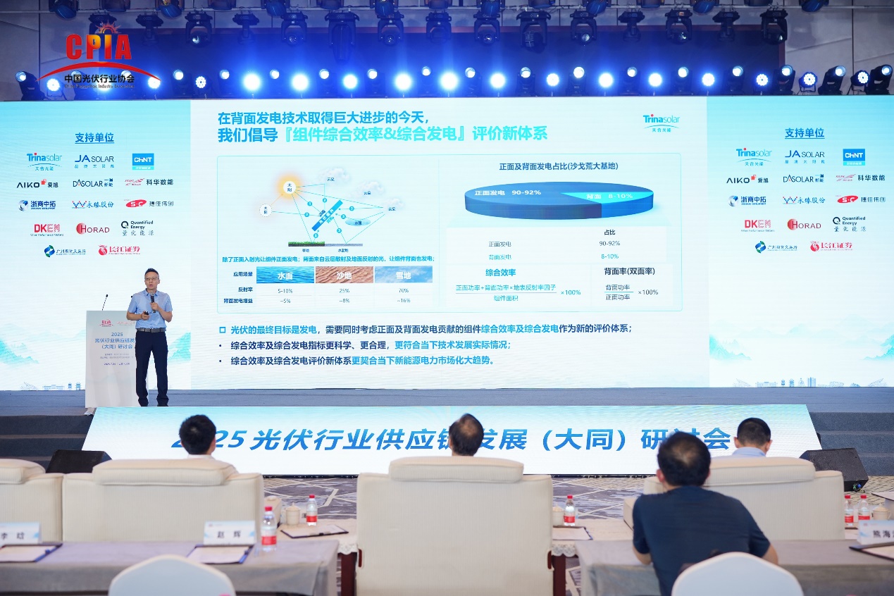 7月24日,天合光能全球战略、产品与市场负责人张映斌博士受邀参加2025光伏行业供应链发展(大同)研讨会并发表以“倡导组件综合效率与综合发电评价新体系”为主题的演讲。在新能源全面入市背景下,他呼吁建立以“组件综合效率与综合发电”为核心的评价新体系,优化电站投资测算模型和逻辑,助力客户提升投资收益率,为光伏产业高质量发展注入新动能。