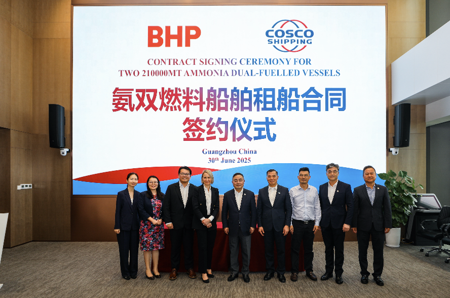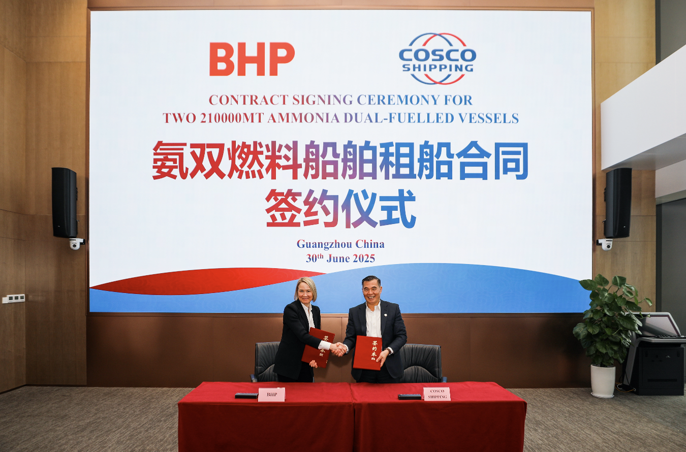 7月2日,必和必拓与中远海运旗下中远海运散运签署两艘21万吨氨双燃料Newcastlemax型散货船的租赁合同,这两艘散货船将成为全球少数可以使用氨燃料的商用船舶,预计2028年交付,主要用于从西澳大利亚到东北亚地区运输铁矿石。