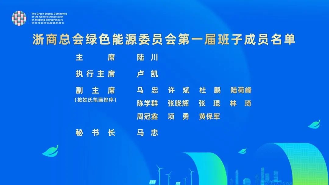 到场委员对浙商总会绿色能源委员会主席候选人与副主席候选人进行了等额选举与举手表决,根据选举结果,正泰新能源董事长陆川当选委员会主席,正泰安能总裁卢凯当选执行主席,国电投黄保军、华能张晓辉、浙银金租陈学群、浙民投投资周冠鑫、杭泰数智能源马忠等11人当选委员会副主席,聘任马忠为浙商总会绿色能源委员会秘书长。