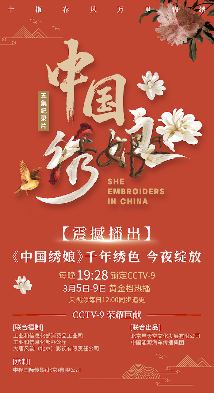 纪录片《中国绣娘》于3月5日至9日晚,在中央广播电视总台纪录频道(CCTV-9)正式播出。该片由北京星天空文化发展有限公司和中国能源汽车传播集团联合出品,工业和信息化部消费品工业司、工业和信息化部办公厅、大唐风韵(北京)影视有限责任公司联合摄制,中视国际传媒(北京)有限公司承制。全片共五集,分别为《东·繁花起东风》《南·鱼龙舞南溟》《西·云霞绕西岭》《北·丹曦映北国》《中·秋水赋中流》,多维度呈现不同地域文化风情,将人物美、地方美、绣品美、情感美一一展现,凭借千变万化的绣品传递全人类共通的深沉情感,构建起影片独特的“立体审美”,成为时代的美丽缩影,更是献给历史的珍贵珍藏。