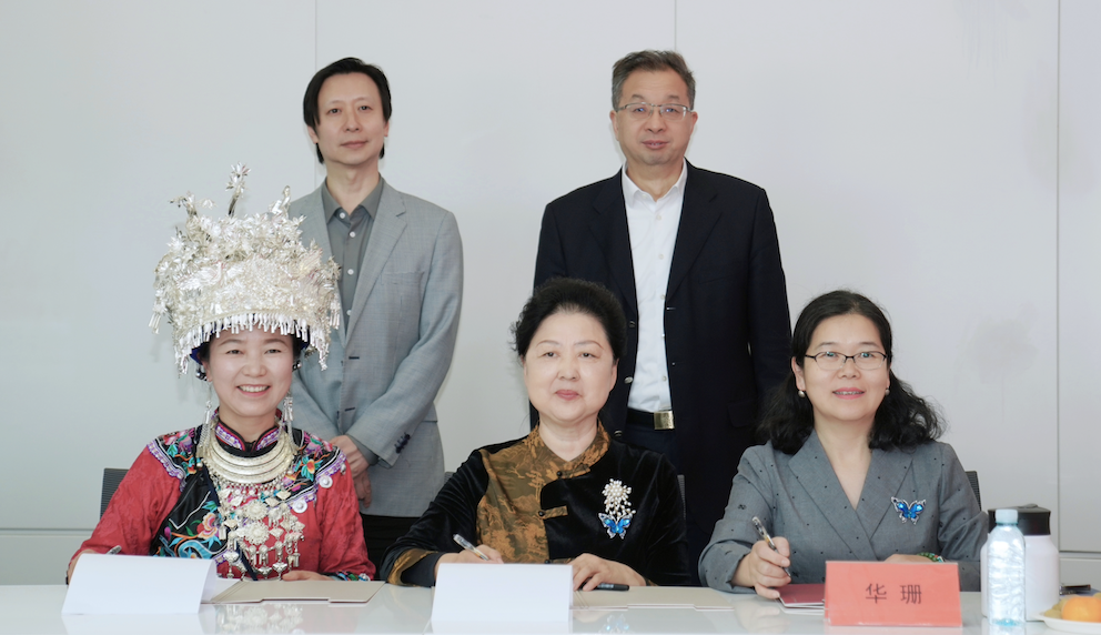 座谈会开始前,在何亚琼司长和谢戎彬董事长的见证下,中国纺织工业联合会非遗办公室、中国绣娘项目组和湖南省湘西州花垣县双龙镇十八洞村签订助力乡村振兴苗绣产业发展战略合作协议。