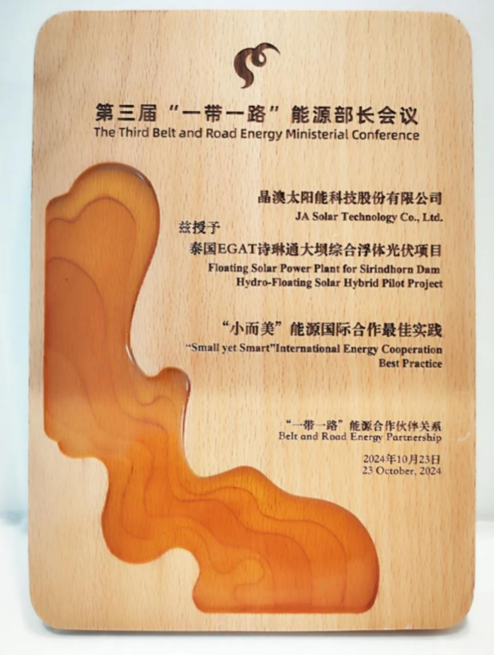 期间,晶澳科技供货全部组件的“泰国EGAT诗琳通大坝综合浮体光伏项目”荣获“一带一路”能源国际合作最佳实践奖,山东省委常委、副省长、省政府党组副书记张海波亲自颁奖,晶澳科技全球化与政府关系办公室主任喻敏登台领奖。在此次所有获奖案例中,晶澳科技是唯一一个获得智能创新类最佳实践奖的光伏制造企业。