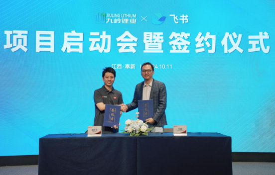 九岭锂业总裁魏冬冬和飞书通用行业商业化总经理张棣完成签约