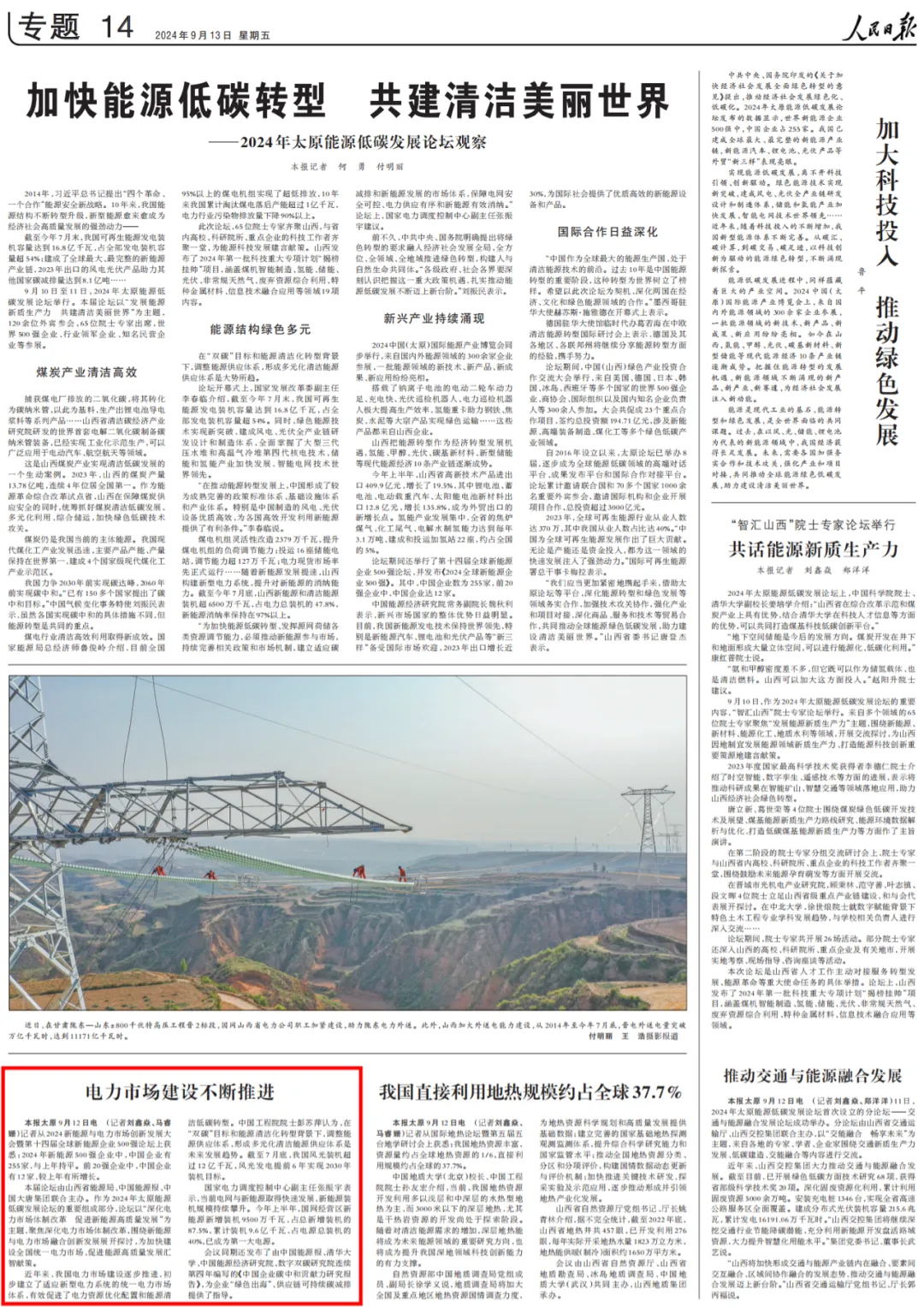 9月13日,人民日报(2024年9月13日第14版)发布了“2024新能源与电力市场创新发展大会暨第十四届全球新能源企业500强论坛”的相关报道。该论坛由山西省能源局、中国能源报、中国大唐集团联合主办,以“深化电力市场体制改革 促进新能源高质量发展”为主题。
