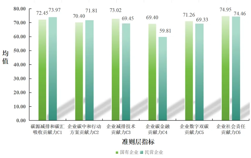 可以看出,国有企业在“C3-C6”四个准则层均值得分均高于民营企业,“企业碳金融贡献力C4”均值得分上明显高于民营企业,主要原因在于大部分纳入全国碳市场的能源企业为传统能源企业,且以央国企居多,对碳资产、碳金融的联系紧密程度比民企要高,且布局较早。民营企业在“企业碳中和行动方案贡献力C2”上,优于国有企业。一方面,民营企业基于可持续发展理念,通过尽早制定碳达峰碳中和行动方案,以推动业务模式和运营方式的绿色转型;另一方面,基于投融资和市场需求,越来越多的投资者和采购商倾向于支持有明确气候行动计划和目标、并已开展相关降碳行动的企业;最后,基于增强企业市场竞争优势、提升品牌形象的需要,展现企业对环境责任的承担,吸引更多关注可持续发展的消费者和合作伙伴。
