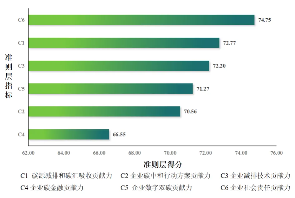 从图中可以看出,六个准则层中,得分越高,表明企业的碳中和贡献力表现越优异,具体准则层平均得分情况为:企业社会责任贡献力C6>碳源减排和碳汇吸收贡献力C1>企业减排技术贡献力C3>企业数字双碳贡献力C5>企业碳中和行动方案贡献力C2>企业碳金融贡献力C4。