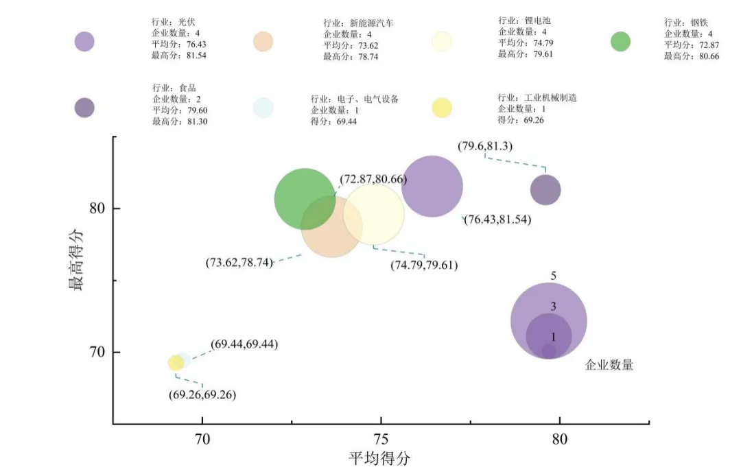 榜单的平均得分为71.63分,其中有30家企业落在了平均分±5%的区间内,这表明大部分企业的碳中和贡献水平接近于平均水平;榜首与榜尾企业之间的分差超过了20分,进一步凸显了企业在碳中和行动上的表现差异。