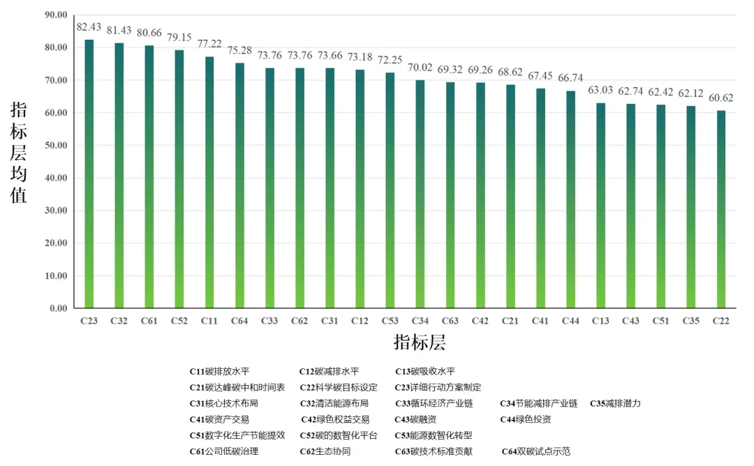 从指标层来看,企业低碳治理成效显著,数字化节能提效需加强,得分情况显示出较为显著的差异。“详细行动方案制定C23”的平均分最高,表明,在国家提出“双碳”目标以及“1+N”顶层设计文件的背景下,企业能够迅速响应相关政策与指导文件,众多国有企业及大型民营企业已相继制定了详细的行动方案。“科学碳目标设定C22、减排潜力C35、数字化生产节能提效C51”得分较低,主要原因是榜单中传统能源企业占比过半,而科学碳目标设定多以新能源及其产业链企业为主。传统能源和新能源产业贡献力指标得分结构相似,但分值差距明显,主要由于当前市场越来越多的传统能源企业受制于“能耗双控”影响以及自身碳减排工作部署要求,均开始主动布局新能源产业,强化可再生能源供给能力。