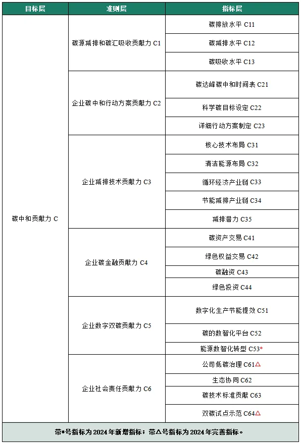 为确保碳中和贡献力评价工作的延续性和一致性,研究团队继续采用层次分析评价模型评估企业碳中和贡献力,与2021—2023年度《报告》保持一致。中国能源企业碳中和贡献力评价指标体系准则层,从六个维度进行评价。