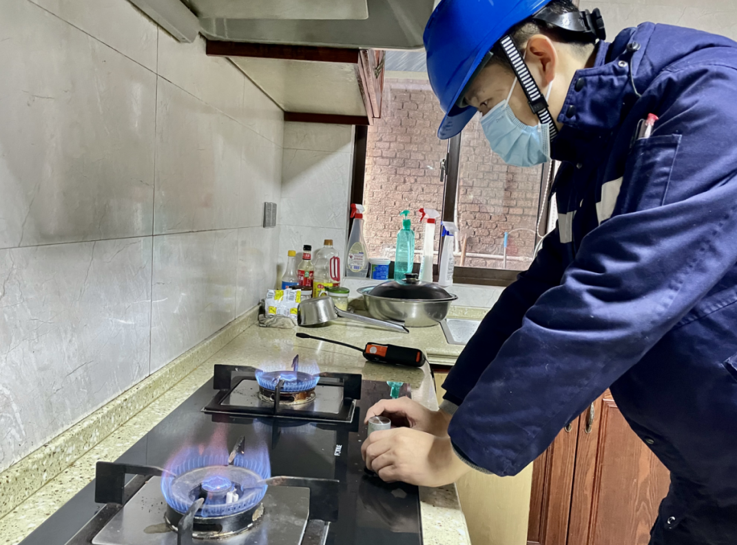 浙能燃气安吉公司安检人员正在老小区为用户调试天然气设备,确保用气安全。周莉琪/摄