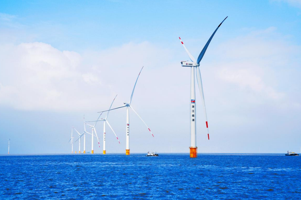 在杭州湾海域,风机群擎天而立输出绿色电能。 浙江新能/提供